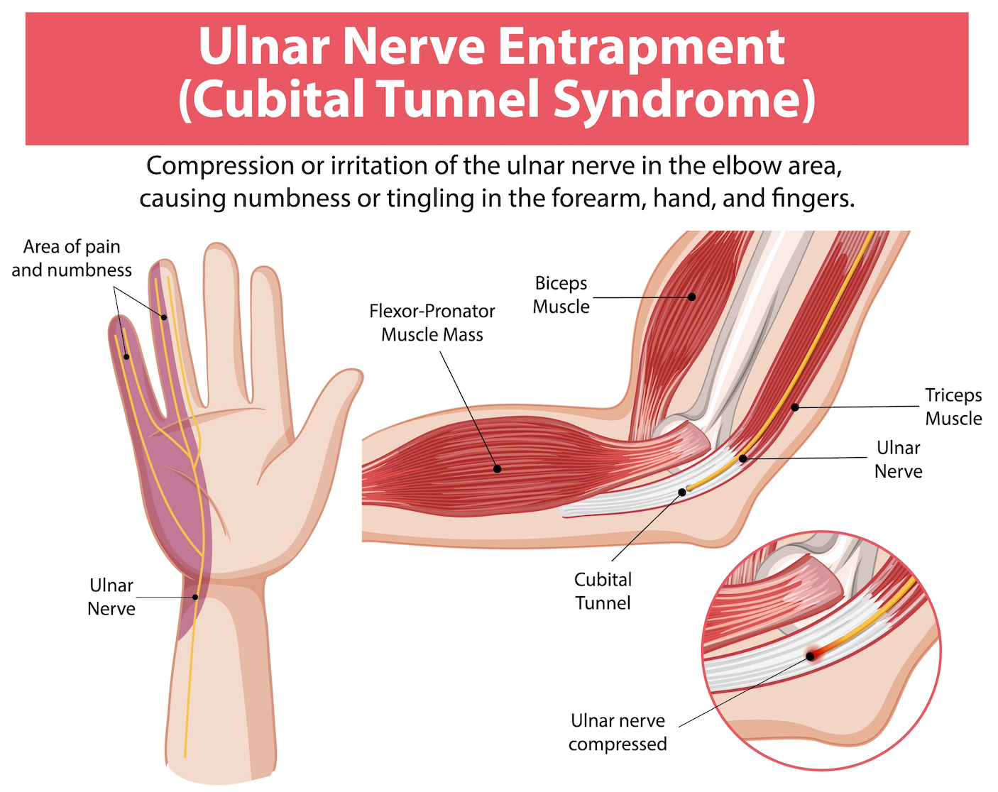 Cubital tunnel syndrome results from pressure on the ulnar nerve as it passes through a confined space at the elbow's inner aspect - the area known as the "funny bone." This nerve supplies sensation to your little finger and half of your ring finger, while also powering the small intrinsic muscles that control fine hand movements.